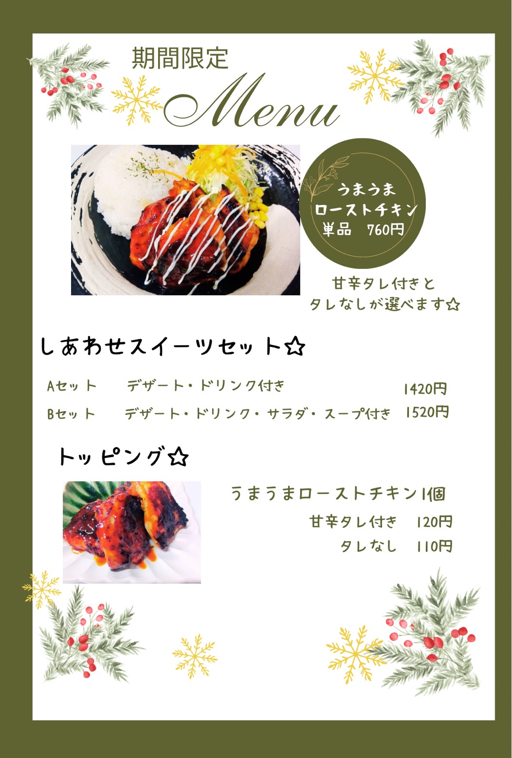 今年最後の期間限定メニューは、ローストチキンです! タレに漬け込んだお肉をオーブンでじっくり焼き上げています。 そのまま食べても美味しいですし、甘辛タレをかけても美味しくお召し上がりいただけます🍴 セット、単品、ご用意しておりますので、 お好きなスタイルでご注文下さい😊